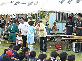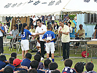 弊クラブが後援しております「第22回福井市少年サッカー大会」が下記の通り開催されました。サッカー競技を通して地域スポーツの振興と親睦を深めるとともに、少年達の健全育成とフェアプレーの精神を養うことを目的としています。閉会式での列席と、表彰式典における賞品の授与へのご参加、また競技の観戦を行いました。