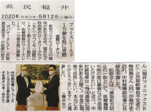 この度、国際ロータリー第2650地区より、医療物質(フェイスシールド)を一万個、福井県に寄贈してまいりました。松原ガバナーエレクトと梅田次期幹事長予定者で福井県庁を訪れ、中村副知事に『感染拡大防止の一助として、医療機関や県の窓口で活用して頂きたい』とお伝えし、お渡しいたしました。中村副知事より、『飛沫感染に大変効果があると聞いている。早急に現場で活用したい。』よりと感謝のお言葉を頂きました。医療従事者や関連機関のみなさまの安全確保のお役に立てることと期待します。1日も早いコロナの終息を目指して、今後も、私達にできる限りの支援を続けていきたいと思います。